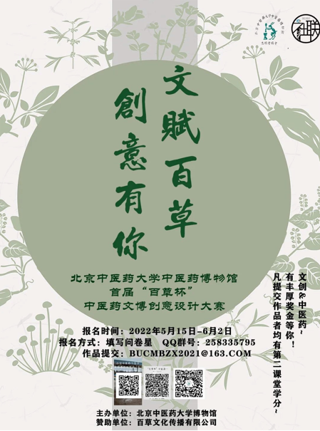 为深入贯彻实施国务院办公厅印发的《“十四五”中医药发展规划》,挖掘培育中医药文化传承和创新人才,推动中医药文化创造性转化、创新性发展,积极响应文化强国战略、建设社会主义文化强国,对接国家中医药博物馆举办全国中医药博物馆文博创意设计大赛。博物馆和协会特举办北京中医药大学中医药博物馆首届“百草杯”中医药文博创意设计大赛。