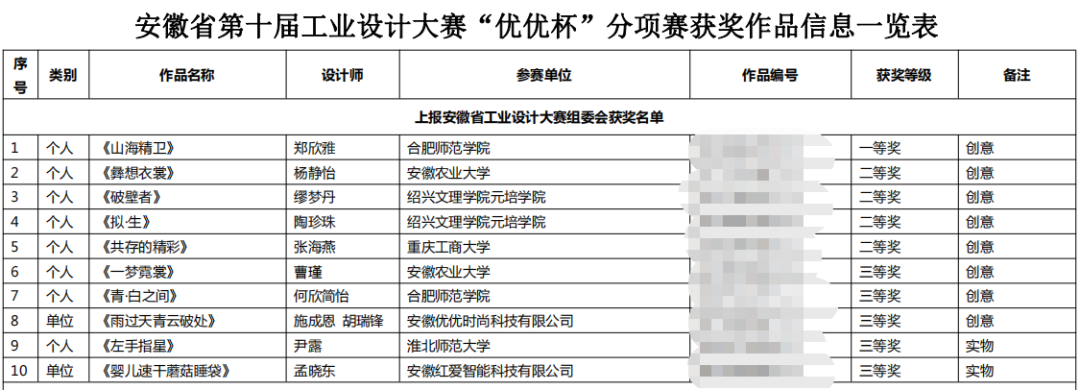 经安徽省经济和信息化厅批准,在安徽省第十届工业设计大赛组委会的指导和颍上县经济和信息化局的监督支持下,由安徽优优时尚科技有限公司主办、安徽农业大学轻纺工程与艺术学院承办的“优优杯”纺织服装创意设计分项赛,圆满落下帷幕,现就分项赛获奖作品信息公示如下: