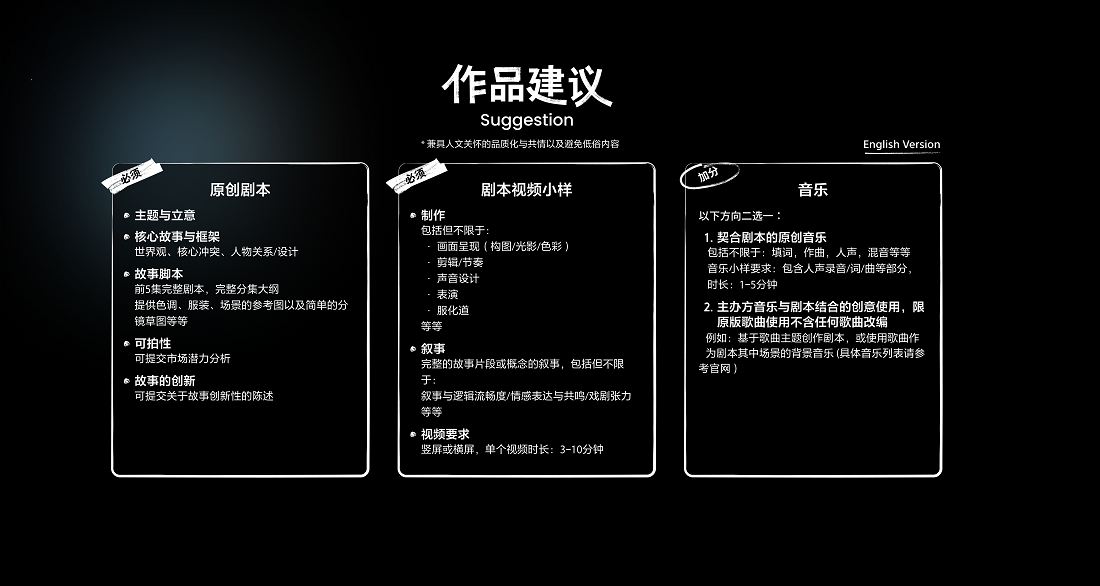 *原创音乐环节,创作主体应确保该等音乐作品符合著作权法关于作品原创性的核心要求;及保证原创音乐的全部创作环节(包括但不限于旋律创作、和声编排、歌词撰写、编曲制作等)不得使用生成式人工智能相关软件及工具,避免因人工智能介入导致的版权归属争议及侵权风险。